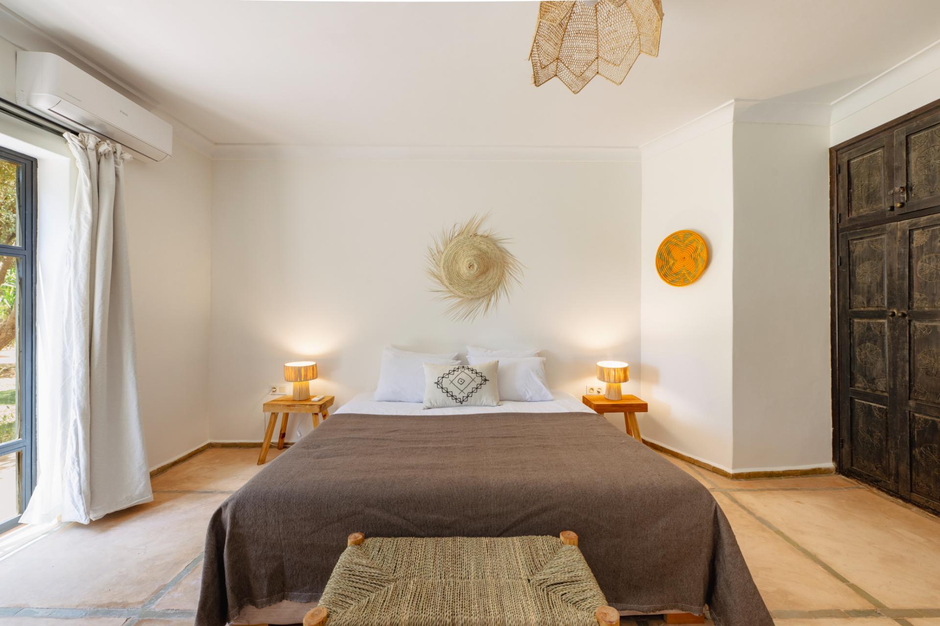 Chambre de 25 m², véritable havre de paix avec terrasse privée donnant sur le jardin luxuriant.